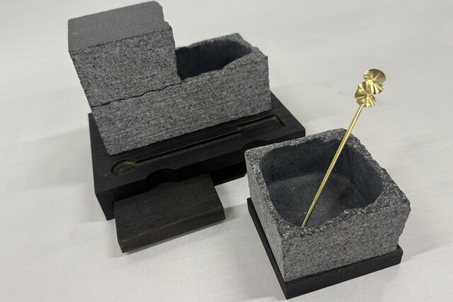 材料は錫と銅の合金である砂張と呼ばれる合金が使われています。 鋳型に流し込んで形成し、表面をまんべんなくたたいて金属を締めた後、焼き入れ、色付けを経て完成した銅鑼は、深い余韻を残した柔らかな音色で茶事席を静めてくれます。